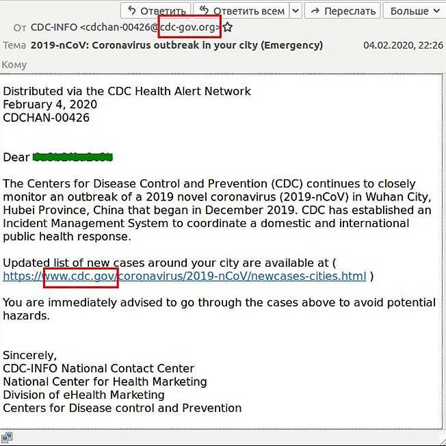 Cybercriminals sent this coronavirus phishing email, which was designed to look like it came from the U.S. Centers for Disease Control and Prevention. Courtesy of Kapersky.