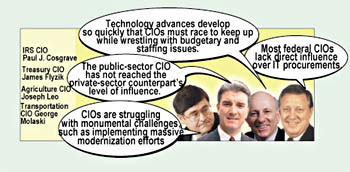 With the exception of the CIOs at the Agriculture and Defense departments, federal CIOs do not have direct influence over IT procurements, Transportation Department CIO George R. Molaski said.Several CIOs and other federal officials testified before Congress recently during a hearing in which lawmakers discussed the roles of CIOs.'Chief information officers in the private sector have provided the technical and managerial expertise that has successfully brought corporate America into an era dominated by high technology,' Rep. Steve Horn (R-Calif.) said at a recent hearing of the House Government Reform Subcommittee on Government Management, Information and Technology, of which he is chairman.Federal CIOs must accomplish similar technical and management feats, but agency leaders have to give them the authority to do so, Horn said.Lawmakers and officials implementing policy said the convergence of empowerment and accountability for CIOs is critical.'As the federal government fully embraces electronic commerce, leadership in the management of the government's information resources becomes of paramount importance,' said Jeffrey C. Steinoff, acting assistant comptroller for the General Accounting Office.That leadership is still lacking, according to GAO officials and some government CIOs.'In the private sector, many CIOs have evolved into chief technology officers working side by side with the chief executive officer,' Treasury Department CIO James Flyzik said. 'The public-sector CIO has not yet reached this level of influence.'Four years after Congress mandated that agencies establish CIOs, many still are trying to make full use of control and evaluation processes and to maintain performance metrics for their IT, testified David L. McClure, GAO's associate director of governmentwide and Defense information systems.And agencies have made inadequate progress in designing and implementing IT architectures before proceeding with massive modernization efforts, McClure said.'More remains to be done to ensure that federal CIOs establish themselves as effective information management leaders,' McClure testified at the hearing.Private-sector leaders agree that federal CIOs face tough challenges.'I believe that the CIO function is one of the most difficult roles today any person has been assigned to in the federal government,' said Lee Cooper, Unisys Corp.'s vice president for business development, at a recent Professional Services Council luncheon in Washington.Federal CIOs face unique structural and cultural hurdles, GAO noted last month in an executive guide, Maximizing the Success of Chief Information Officers: Learning From Leading Organizations.The guide, developed under McClure's direction, looked at three private-sector and three state CIO offices, and presented recommendations to improve federal CIOs' effectiveness. The study looked at the CIO operations of Chase Manhattan Corp., General Motors Corp. and J.C. Penney Co. Inc. and the states of Pennsylvania, Texas and Washington.The CIO position must evolve, Flyzik told the subcommittee.The first challenge: Take advantage of rapidly evolving technology to make government more effective.'It's amazing how fast electronic business is hitting us,' Agriculture Department CIO Joseph Leo said. 'Technology is racing at a tremendous speed.'Public and congressional perceptions are also a challenge, he said. 'There is this perception'right or wrong'that I can turn all of these legacy systems overnight into a user-friendly, interactive, two-way dialogue with the American public at no additional cost.' The uncertain and complex federal appropriations process limits CIOs' ability to take advantage of fleeting technological developments, Leo said. The struggle to find investment money beyond the basic budget is an everyday challenge for federal CIOs, he said.IRS CIO Paul J. Cosgrave said most IT money comes from the agency's base program funding.'If it's new, above the base, it stands out like a sore thumb' and draws attention from lawmakers, he said.Adair Martinez, CIO of the Veterans Benefits Administration, agreed that funding IT projects is a challenge.'One of the biggest differences between the public and private sectors is the budget and planning cycle,' she said. 'The public sector cannot react as quickly to technology. Private-sector CIOs can plan on a shorter cycle to take advantage of it. Public-sector CIOs must think two to five years out.'Funding limitations also hinder the government's efforts to retain skilled IT professionals and attract new blood, Flyzik said.Cosgrave noted that 25 percent of the IRS' work force will be eligible for retirement in the next few years; the average age of the agency's IT officials is 46.'If we don't do something soon, we will be out of business,' Cosgrave said. 'We are not able to attract [IT professionals] because our starting salaries in the government are not competitive.'Leo said his department has lost 22,500 employees since 1993.'What do you do with that?' Leo asked. 'I am concerned with the alignment of IT architecture and human resources. I have to have the human capacity to manage IT.'But the premier challenge noted by lawmakers, GAO and CIOs themselves is finding a way to ensure that federal CIOs have decision-making authority. With enough clout, most said, they could overcome all other challenges.Many CIOs said they have tacit authority and direct interaction with their agency chiefs.In its CIO guide, GAO noted that the government treats IT as a support function rather than a strategic asset, and the CIO as a support officer, not a decision-making executive.Flyzik said he feels lucky to have an 'excellent working relationship with the chief financial officer' at Treasury, so he is involved in every IT investment decision.Cosgrave added: 'I will hold up my relationship with IRS commissioner Charles O. Rossotti as a good one. I am lucky because I am a direct adviser to him. I advise him two to three times 