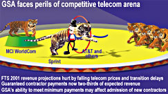 The GAO report, , said falling prices and the delay in agencies' transitions to the new contracts from the mandatory FTS 2000 contracts contributed to the lower estimates'despite the fact that service demands are increasing.Total revenue over the eight-year contracts awarded to Sprint Corp. and MCI WorldCom Inc. in December 1998 and January 1999, respectively, still should be enough to meet guaranteed minimum payments totaling $1.5 billion. But guarantees now amount to two-thirds of projected revenue and will not be reached until the sixth year, GAO estimated.The new revenue figures are no surprise to GSA, said Bruce Brignull, the agency's assistant commissioner for service development.'We realized when we got the best-and-final offers that we were setting a much lower baseline on prices, and that meant the minimum revenue guarantees were a more significant part of the contract,' Brignull said.He said the GAO study confirms that GSA still can comfortably meet its revenue obligations under current service projections.Additional competition for government long-distance business would increase pricing pressure and might jeopardize GSA's ability to meet the revenue guarantees, however.'A recent GSA analysis showed that with less than a 20 percent decline in total estimated program revenue, [minimum revenue guarantees] would not be satisfied until contract year eight,' the report said.If the guarantees cannot be met during the term, 'GSA may be liable for additional payments to the contractors,' GAO said.Lower prices from greater competition could bring benefits to agencies that would offset GSA obligations to pay off the guarantees. GAO said such benefits are difficult to quantify, but Brignull said they are real.'Agencies are seeing significantly reduced costs for services,' he said. The government depends now more than ever on communications services, and cost reductions will let agencies expand comm use while staying within current budgets. 'So there is a benefit to the taxpayer,' Brignull said.Because FTS 2001 is not mandatory, agencies have the option of going outside the program to procure long-haul services. The Federal Technology Service also has the option of letting contractors in its Metropolitan Area Acquisition local service program compete within FTS 2001.AT&T Corp. has asked for modifications to its MAA contract to let it enter FTS 2001 []. FTS commissioner Sandra Bates said meeting the minimum revenue guarantees is an important consideration in deciding whether to admit AT&T but will not be the deciding factor.Enlisting the help of telecom consultant Technology Futures Inc. of Austin, Texas, GAO verified GSA's latest FTS 2001 numbers, finding that $2.3 billion is an accurate though conservative es-timate of revenues.One reason for the low estimate is the lagging pace of transition to the new contracts. FTS originally expected that by January agencies would have largely finished cutting over to new services, but only about a third of agencies have done so. GSA officials estimated that the delay has resulted in more than $450 million in lost revenue.At the current rate, only about 85 percent of agencies will have moved to new contracts by the time FTS 2000 bridge agreements expire Dec. 6.GAO cited reasons for the slow transition:''The sluggish pace of vendor selection and transition planning''Agency preoccupation with year 2000 fixes''Poor communication within service provider organizations and among service providers, agencies and local exchange carriers''Lack of transition agreements between the government and AT&T, which had about 80 percent of federal long-distance business under FTS 2000.To speed things up, GSA entered into a transition agreement with AT&T in January to move its customer agencies to MCI WorldCom's FTS 2001 contract. A similar agreement for other agencies' transition from AT&T to Sprint is pending.