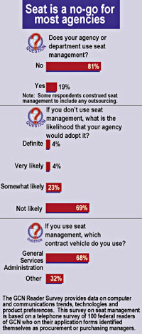 By Richard W. WalkerGCN StaffNot sure exactly what seat management is? You're not alone.Or, if you know what it is, do you have doubts about it? You've got company, too.A fair number of feds are uncertain about what seat management is or how it works, while others say there are too many question marks about it for their agency to adopt it, a recent GCN telephone survey of 100 procurement officers and purchasing managers found.More than a quarter of those contacted'26 percent'said either that they didn't know what seat management is or they weren't familiar enough with seat management to discuss it.A large number of survey participants, 69 percent'including those who reported that they weren't familiar with seat management'said that their organizations weren't likely to adopt seat management.About 19 percent of feds surveyed said their agencies use seat management, although that percentage is probably misleading because some participants took seat management to denote any sort of outsourcing.Of those who said their agencies had adopted seat management, 68 percent said they use the General Services Administration's Seat Management Services contract.About 23 percent of respondents not involved in seat management said it was 'somewhat likely' that their agencies would adopt it. Only 4 percent said they 'definitely planned to' move to a seat management approach and another 4 percent said it was 'very likely' that they would adopt it at some point.Nearly 33 percent of purchasing managers who participated in the survey declined to offer thoughts or comments about the concept of seat management because their agencies had no need or plans to adopt it.Of other feds whose agencies don't use seat management but were knowledgeable about it, 42 percent voiced wariness about the approach and enumerated a variety of doubts.The largest single issue was cost. Nearly 13 percent of respondents thought it would be more expensive to move to seat management than to own and manage computer assets internally.'I don't think it's cost-effective,' said an Air Force systems accountant.At an agency in Washington, another systems accountant said his only real problem with seat management was cost. But it was a big enough concern that it would likely deter his agency from taking a serious look at it, he said.'It's difficult to get a handle on how the costs justify themselves,' said a senior technical adviser at the IRS.Other participants, totaling 10 percent, voiced misgivings about the mechanics of seat management contracts. 'I'm worried about length of the commitment,' one fed said. 'I hear the contracts can be limiting.'Some were apprehensive about vendors fulfilling upgrade requirements.'Upgrading the systems is my primary concern,' said one buyer. 'I wonder if it can be done quickly enough to do our daily tasks at the level we are doing them now.'Perceived lack of flexibility was the primary worry for a Navy business-area manager in San Diego. 'I hear [seat management] is too structured,' he said.Another anxiety was loss of control. Nine percent of participants were wary of giving up control of their systems.''I just can't see my agency relinquishing control of our systems to a second party,' an Interior Department purchasing official said.