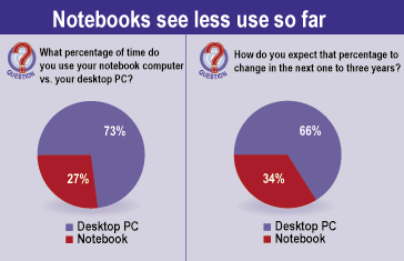 By Richard W. WalkerGCN StaffLook for the upsurge in notebook computer use on the government scene to continue.In a recent GCN telephone survey, feds predicted a substantial increase in their notebook use over the next few years'to more than a third of their computing time.They also anticipated a corresponding decline in time spent at desktop PCs.Survey respondents on average said they currently use their notebooks 27 percent of the time and desktop PCs 73 percent of the time.In the next one to three years, they expected to step up notebook use to an average of 34 percent of the time, against 66 percent for their desktops.One of the feds who anticipated doing more notebook toting within the next 36 months is Jay Hokanson, an electrical engineer for the Federal Communications Commission in Lakewood, Colo. He uses a notebook from NEC America Inc. of Melville, N.Y., mostly when he's traveling.Hokanson estimated that he utilizes his notebook for about 25 percent of his computing time, with the rest of it at his desktop PC.In the next one to three years, Hokanson predicted the percentages will level out to about 50-50.'I'll probably be spending more time out of the office, and maybe will be doing a small amount of telecommuting with the notebook as well,' he said.At Hill Air Force Base in northern Utah, computer specialist Stephen Huntington, who goes on the road with an Inspiron 7000 from Dell Computer Corp., also foresees a rise in his notebook use, from about 20 percent of the time to roughly 40 percent.That will occur, he said, simply as a matter of course as portable-computer technologies improve.'I'm very keen on the new technologies maturing enough to create the capacities and abilities that the desktop has within a notebook,' Huntington said. 'There's a lot of work you can't do from a notebook that you can do from the desktop. But when wireless communications and the security of those communications mature, then the desktop can become more portable.'He also looks forward to developments such as voice-actuated input, which will reduce the typing he has to do on cramped notebook keyboards.Despite the shortcomings of notebooks'users polled griped mostly about too much weight, short battery life and hard-to-use pointing devices []'18 percent of feds in the survey have dispensed with desktop PCs altogether. They're using their notebooks full-time.In San Diego, for example, Navy maintenance coordinator Tom Bunch's constant companion is his Dell Inspiron 7500''much to my wife's chagrin.''I like the mobility of using a notebook,' said Bunch, who parks his Inspiron in a docking station when he's in the office. 'You can take it anywhere.'But most feds surveyed'82 percent'still use their notebooks principally for out-of-the-office computing, not as replacements for their desktop PCs.About 72 percent of those surveyed said they take their notebooks on the road either all the time'45 percent'or most of the time'27 percent.Of the feds who carry notebooks on the road, 83 percent used their machines to access e-mail, the Internet, agency intranets and enterprise data from remote locations.E-mail was the biggest item on the list. Almost all of the feds in the survey'99 percent'used their notebooks to send and receive messages when on the road.Ninety-eight percent said they used a wired modem for remote access. Only 7 percent employed another technology, such as a wireless device, the survey found.