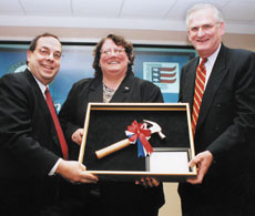 At top left, NPR director Morley Winograd, left, presents the IRS Hammer Award to Colleen M. Kelley, president of the National Treasury Employees Union, and IRS deputy commissioner Bob Wenzel.