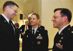 At right, Air Force Col. Terry Pricer, left, Col. Michael Turner of DISA and Lt. Col. Marcus Miller of the Joint Chiefs' office get together.