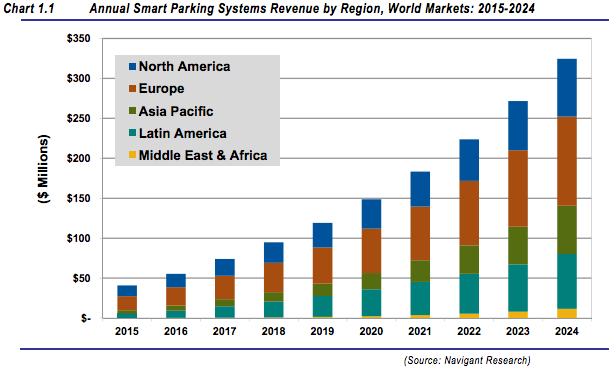 Globally, smart parking’s market worth is priced at $40.9 million in 2015. That number will reach $324.6 million by 2024, per the Navigant Research report, when smart parking will no longer be niche and instead the norm for municipal governments.