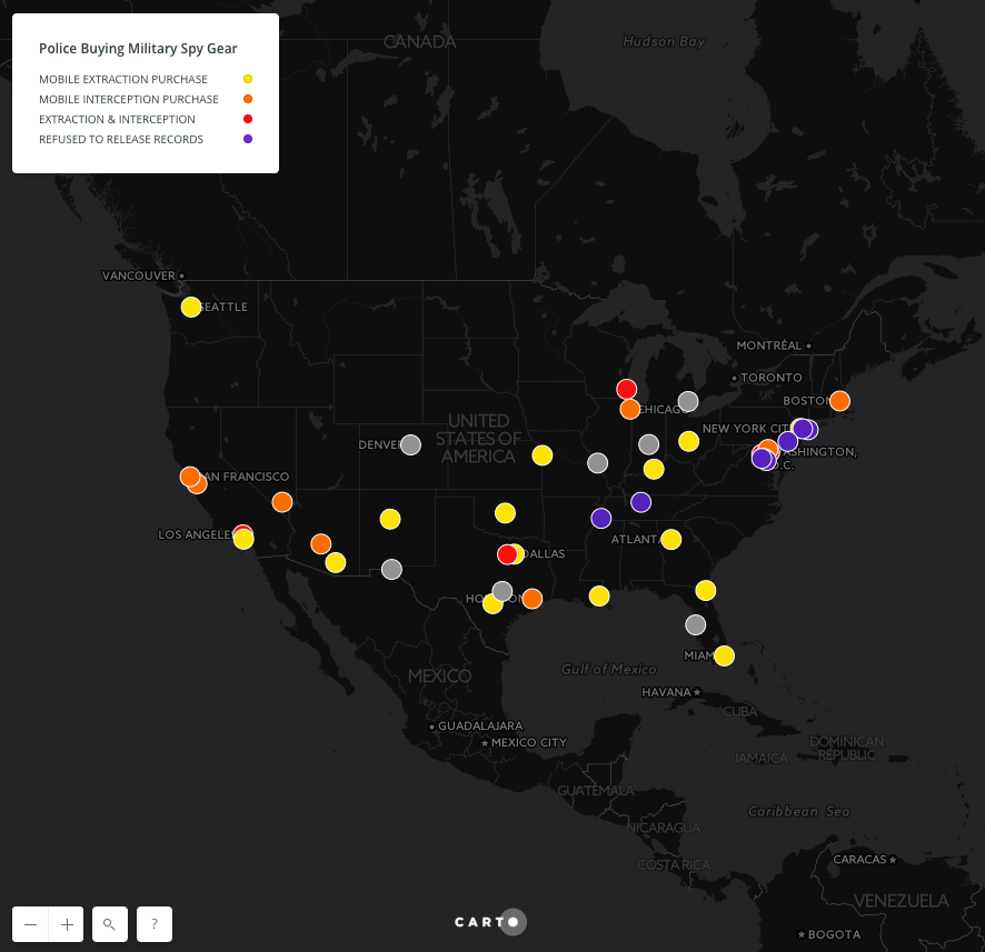 Two decades ago, cellphone surveillance tools were mostly used by federal law enforcement and intelligence community personnel for national security and high-level criminal investigations. But after 9/11, as police departments ventured into counter-terror operations themselves, local cops began to snatch up these sophisticated devices.In December 2015, The Intercept released a catalogue of military surveillance tools, leaked by an intelligence community source concerned by this perceived militarization of domestic law enforcement. The catalogue included tools that could track thousands of people’s cellphones at once, extract deleted text messages from captured phones, and monitor ongoing calls and text messages. Following this news, last April, CityLab began sending public records requests to the top fifty largest police across the country asking for purchasing orders and invoices over 2012 to 2016 related to any of the devices listed in the catalogue. (Note: The fifty largest list is based on data released in 2010 from the Police Pay Journal, and thus does not include some departments now among the top fifty largest).Of the fifty departments sent public records requests, only eight claimed not to have acquired any spy tools leaked by The Intercept’s intelligence source. At least twelve have admitted to having cellphone interception devices, and nineteen have admitted to having cellphone extraction devices. The responses, security-based rejections, and outstanding requests still being processed for CityLab suggest that, at a minimum, thirty-nine of the fifty departments have acquired at least some of these military-grade surveillance tools over the last four years. (Click here to see the original cache of documents, or scroll down to the bottom of this article)