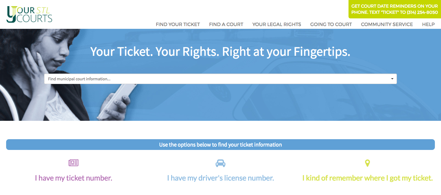 The first thing users see when they visit YourSTLCourts is the slogan “Your Ticket. Your Rights. Right at your Fingertips,” meant to reassure St. Louis County residents who might shirk their fine or their court date.