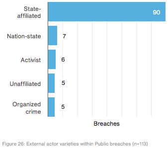 Cyberespionage linked to state-affiliated actors, unapproved and possibly malicious misuse of organizational resources, and errors compromising data security accounted for 81 percent of all such breaches.