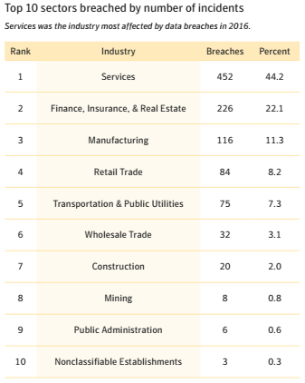 In terms of total number of breach incidents per sector, transportation and public utilities was in fifth place with 75 breaches, or 7.3 percent, and 6,243,712 identities stolen.