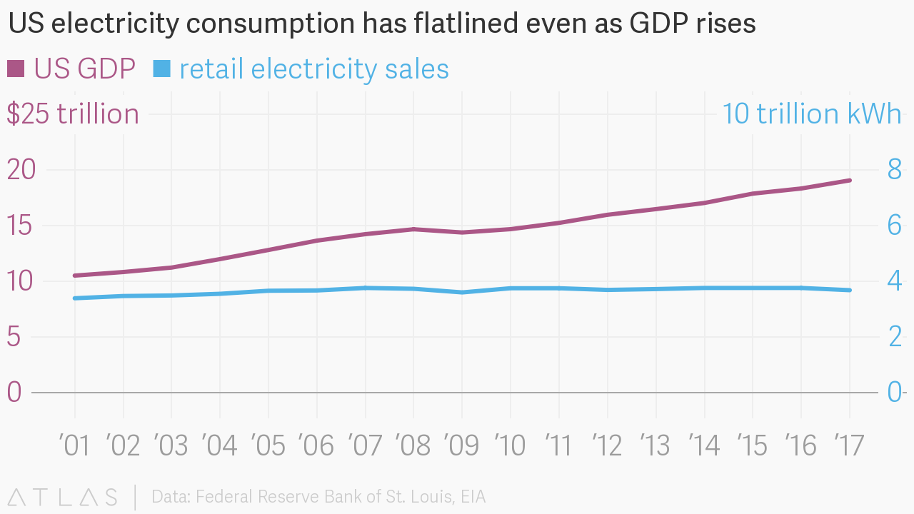 As customers generate their own power from renewable sources, efficiency measures spread, and the economy sheds industrial customers, electricity providers are barreling toward bankruptcy (pdf). Economic growth no longer guarantees higher consumption.