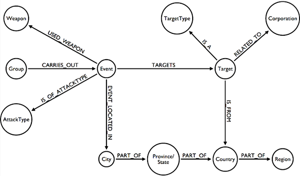 While graph technology can be used to better support the police and other law enforcement officials, it also has applications for other security and investigative use cases like anti-terrorism, border control, and social services. Below is a graph model I made a few years ago as part of some experiments I ran with the Global Terrorism Database, which at the time tracked the 140,000 terrorist attacks from 1970 until 2014.
