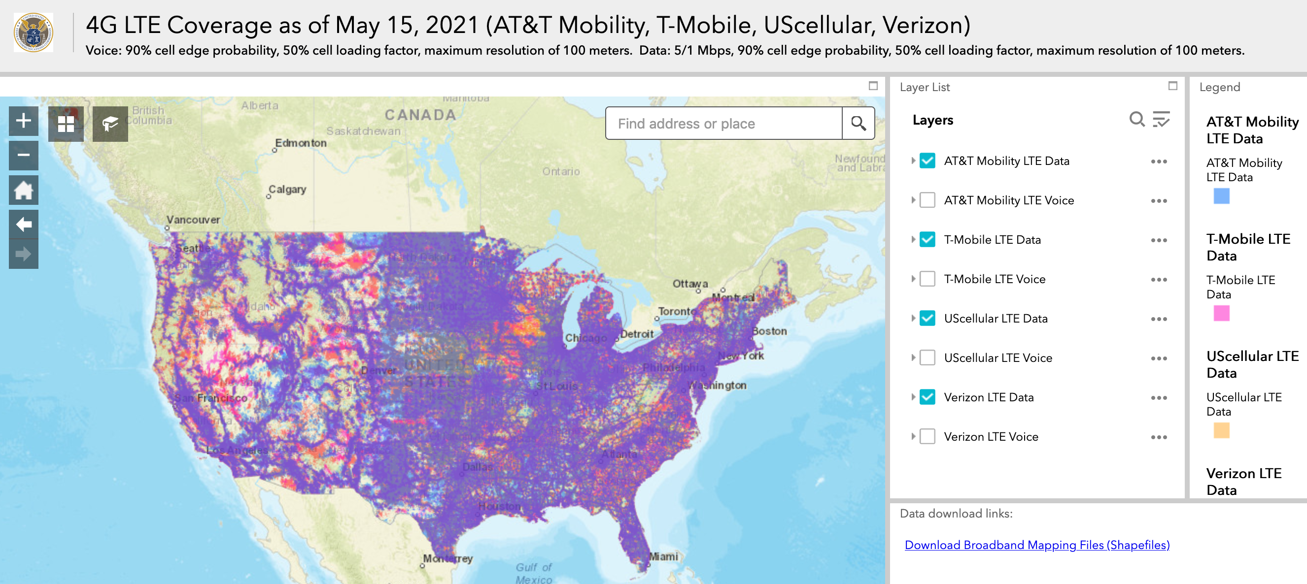 The map shows where Verizon, AT&T, T-Mobile US and UScellular offer LTE voice and data coverage, providing a way for consumers to search coverage by a specific address or geographic area.