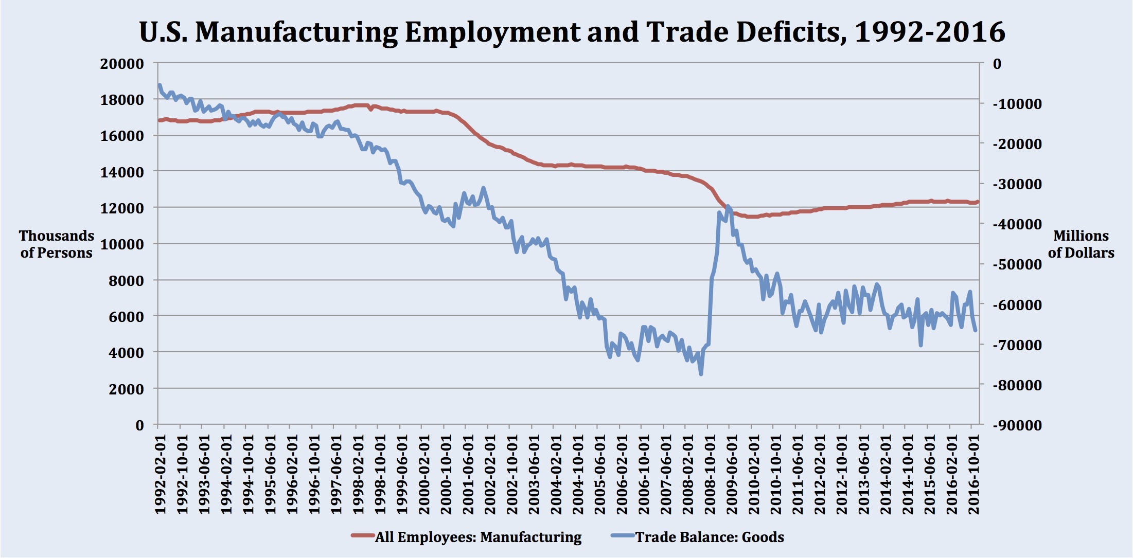 Baker said automated technology eliminated U.S. manufacturing jobs at a moderate pace for decades, all the way back through the 1950s. But those job losses accelerated in the early 2000s as the nation’s trade deficit soared. “The big job loss in manufacturing that people have been talking about in the last 15 years,” he said, “that certainly was trade.”