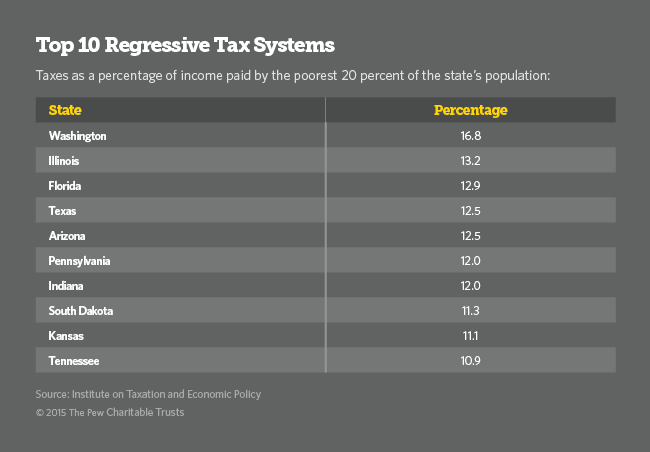 Every state already relies on a regressive tax system, although some states depend on sales and excise taxes more than others, according to the Institute on Taxation and Economic Policy, a liberal think tank. A 2015 ITEP study found that the effective state and local tax rate burden was 10.9 percent of income for those in the bottom 20 percent of income, but just 5.4 percent for those in the top 1 percent.