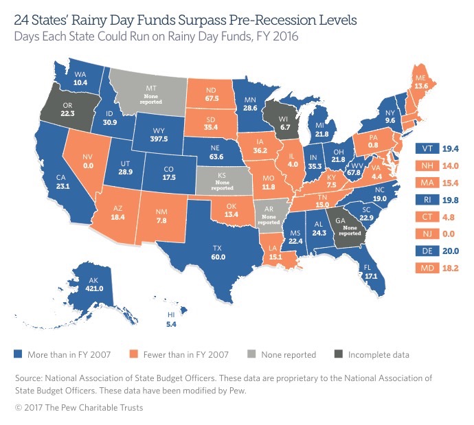 At least 24 states ended fiscal 2016 with larger rainy day funds as a share of operating costs than before the 2007-09 downturn.