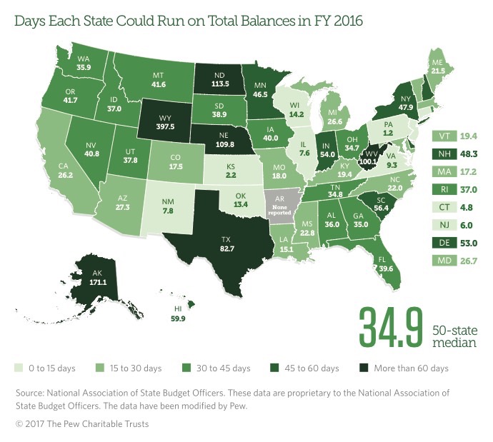- The smallest total balances—less than a week’s worth of operating costs—were held by Connecticut (4.8 days), Kansas (2.2 days), New Jersey (6.0 days), and Pennsylvania (1.2 days).