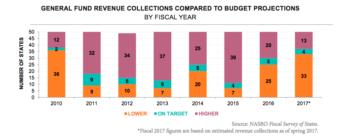 Estimates in the survey show that fiscal year 2017 general fund revenues in 33 states were coming in below forecasted levels. In other words, these states had planned to collect more money to cover the spending outlined in their budget plans. In 2016, 25 states found themselves in this position. In 2015, there were just seven. This year’s figure is the highest level since 2010 when, in the wake of the Great Recession, 36 states saw revenues fall short expectations.