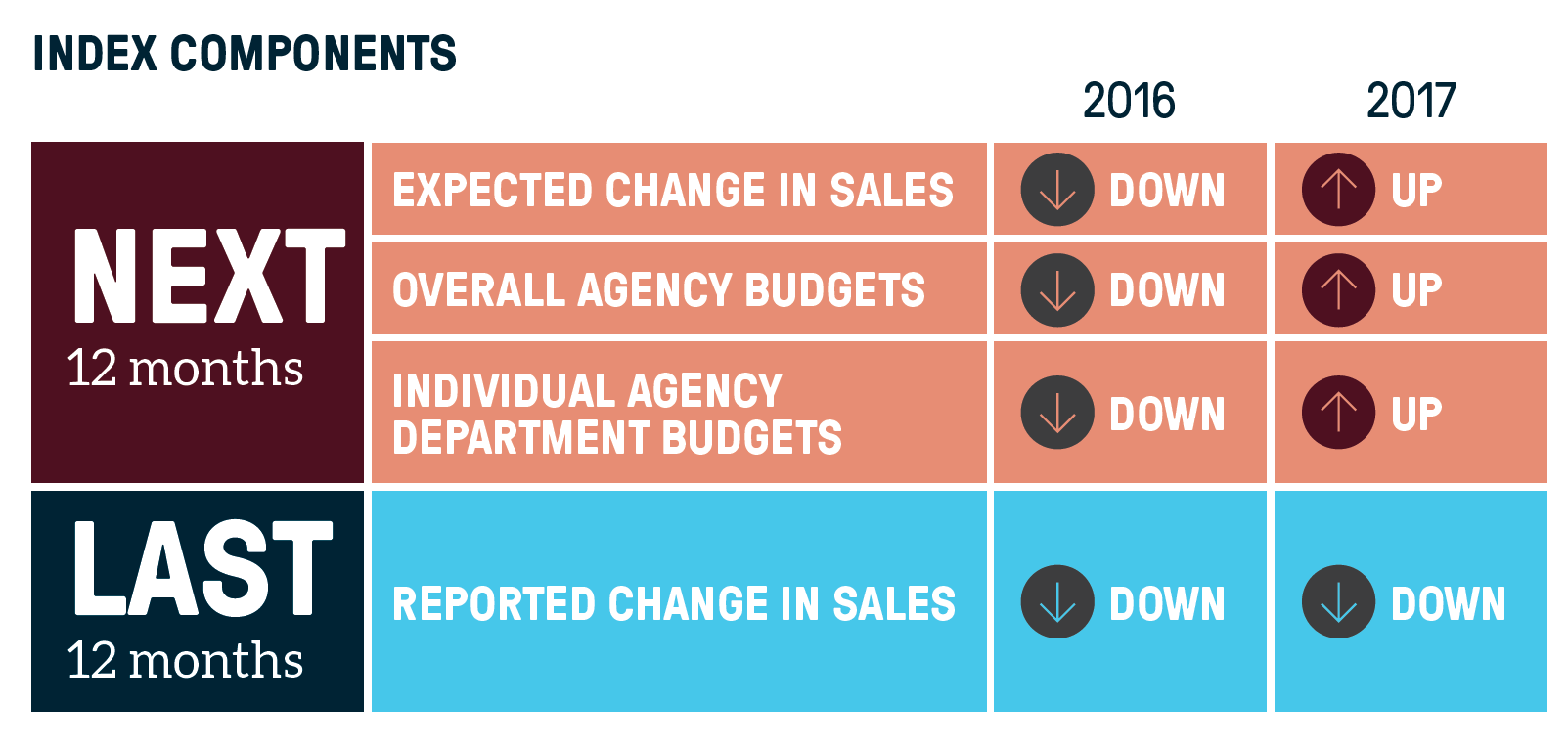 The only component to show a decrease in value this year measures changes in reported or actual sales over the past 12 months (up/down/same). While there continues to be a much higher percentage of contractors that actually grew versus those that declined in recent sales, that gap has narrowed slightly since the previous survey. In other words, while the overall rate of growth of this market continues to be positive overall, that rate has been slightly declining. At the same time, the lift in confidence in the future of government sales points to a likely reversal of this downward shift—with the entire marketplace experiencing higher rates of growth over the next 12 months.