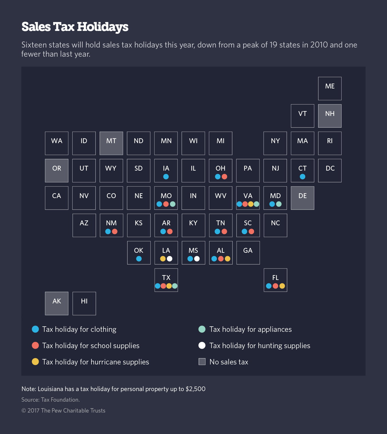 For more than a decade after New York started the modern trend in 1997, the number of states with annual sales tax holidays grew steadily. But the count peaked at 19 in 2010, and this year’s tally is one fewer than last year. The liberal Institute on Taxation and Economic Policy estimates that states lost $300 million due to sales tax holidays in 2016.