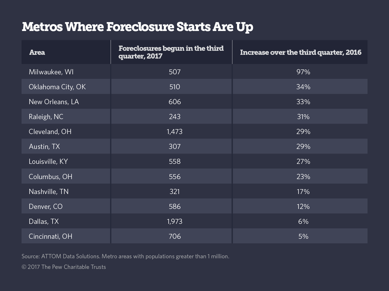 Austin and Columbus posted their largest increases in foreclosure starts since 2012, the bottom of the housing bust, while Nashville and Dallas had seen foreclosure starts drop for about two years before the recent increase.