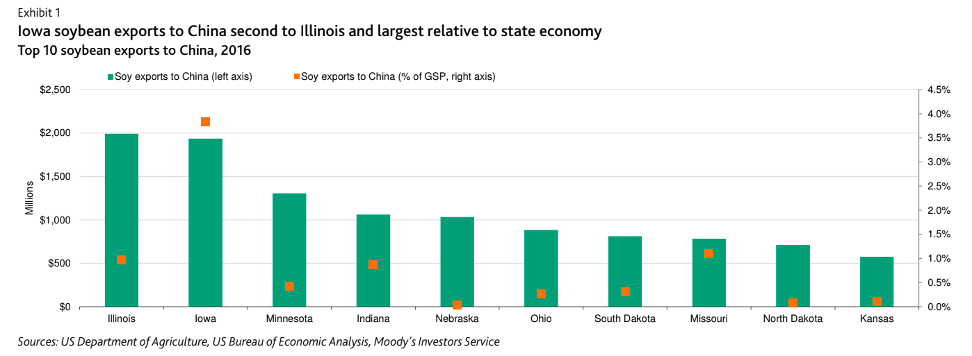 For comparison, Missouri has the second-most exposure with soybean exports comprising a mere 1.8 percent of its GSP, according to Moody’s Investors Service: