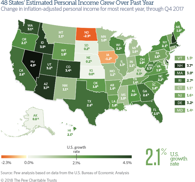 - Looking at recent trends, inflation-adjusted U.S. personal income grew by 2.1 percent in the fourth quarter of 2017 from a year earlier—the fastest pace since the end of 2015 but still below a peak of 4.7 percent at the end of 2014. These results are based on estimates and subject to revision, as is Pew’s ranking of growth rates for state personal income.