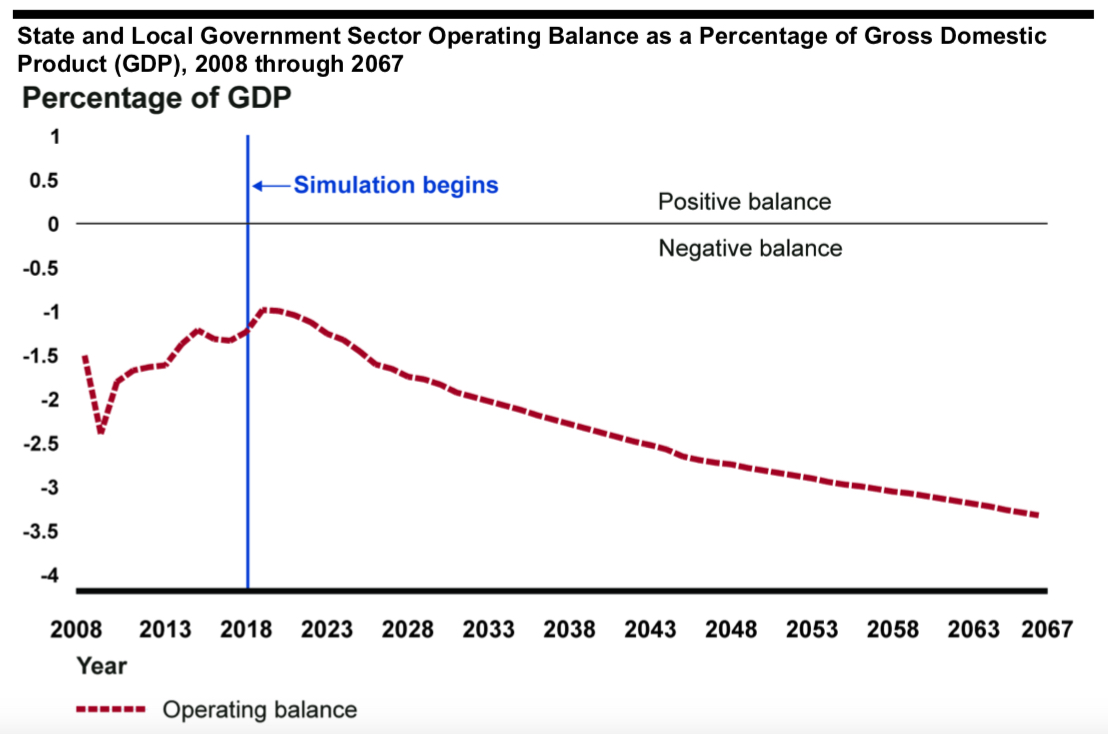 The GAO's findings are based on simulations it has published for about a decade now looking at long-term state and local fiscal trends.