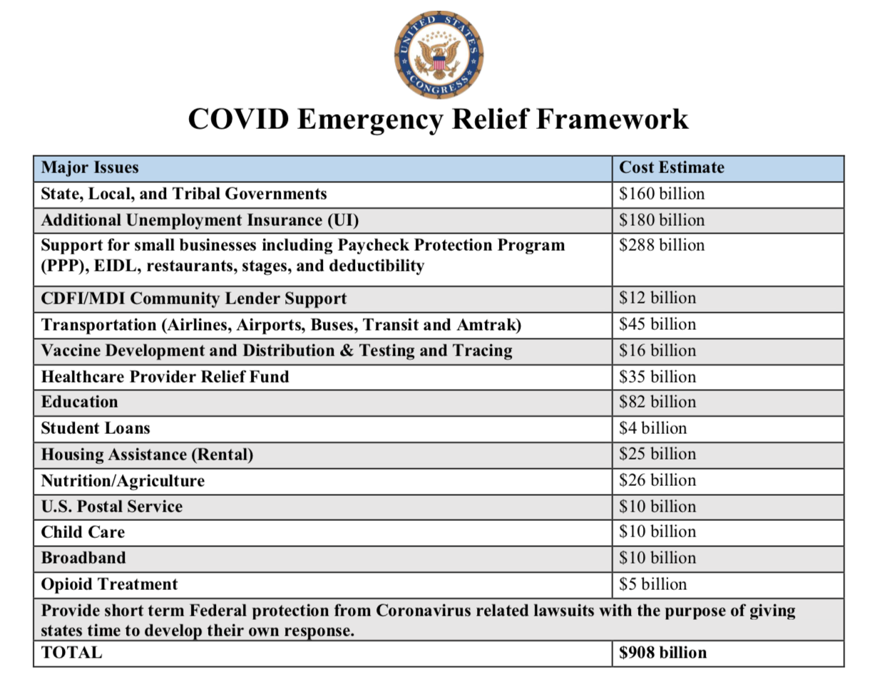 The top spending priorities in the bipartisan proposal include $288 billion to renew the Paycheck Protection Program for businesses, $180 billion to give unemployed people a $300 per week boost to their benefits for four months, and $160 billion in aid for state and local governments.
