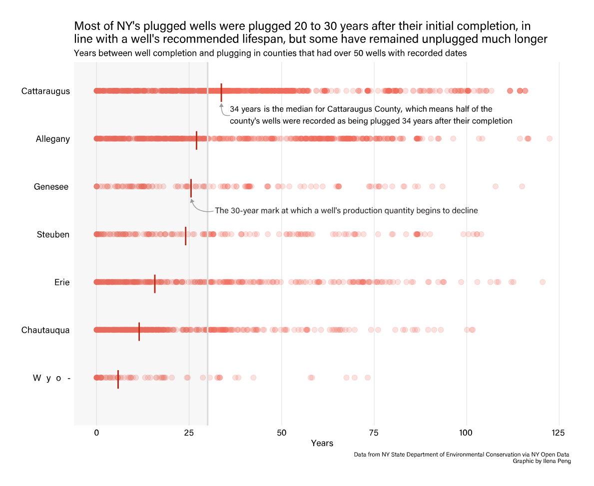 As the era of oil drilling comes to an end in New York, hundreds of active wells are decommissioned every year. According to the Canadian Association of Petroleum Producers, the useful lifespan of a well before it gets plugged is about 30 years. But some wells in New York remain open, unplugged and inactive for much longer. One well in Oswego County, which borders Lake Ontario, was completed in 1890 and was plugged in 2019.