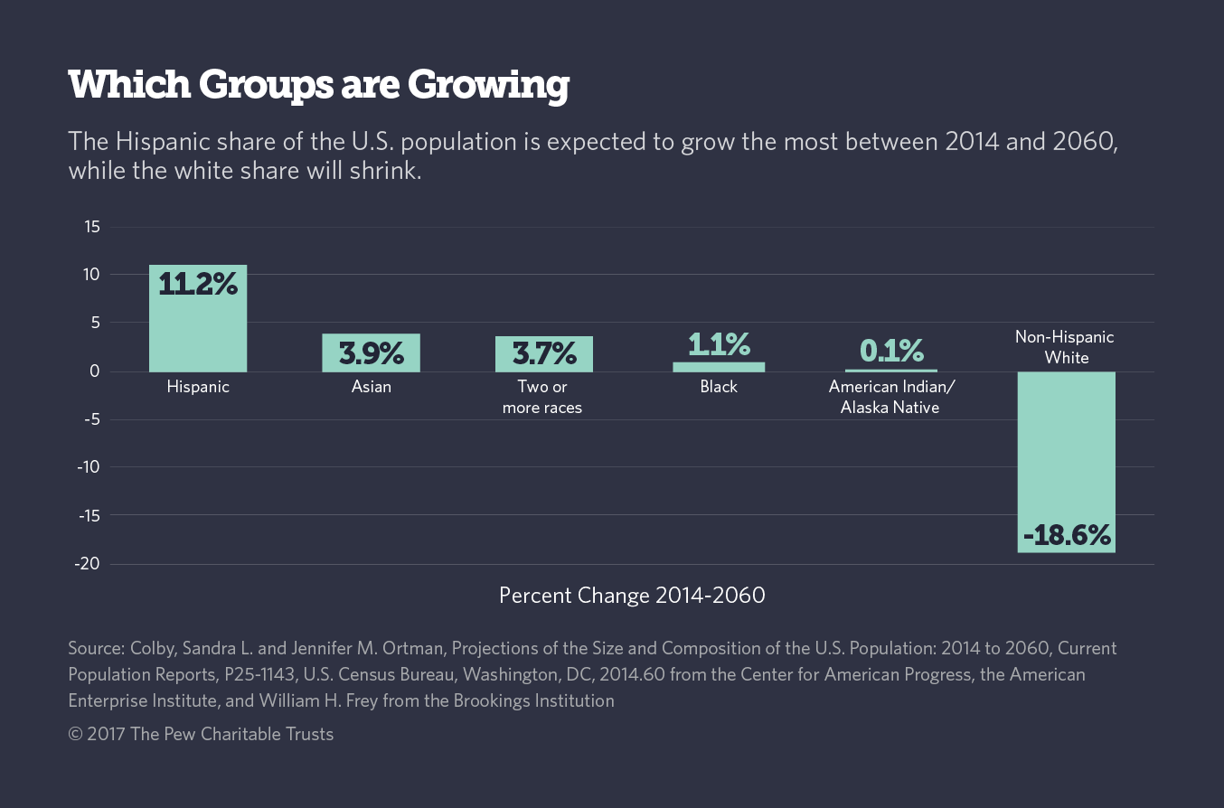 Most of the nation’s population growth since the 1960s has come from the immigration of nearly 59 million people from foreign countries who settled in the U.S. in that time, mostly from Latin America and Asia, according to the Pew Research Center. (The Pew Charitable Trusts funds the Pew Research Center and Stateline.)