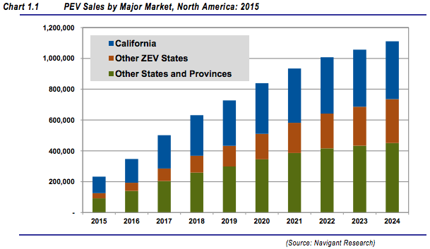 PEVs account for 3 percent of California’s light duty vehicles, with that number expected to jump to 15 to 22 percent by 2024. The U.S.’s nine other ZEV states will see similar growth but nowhere close to the Golden State.