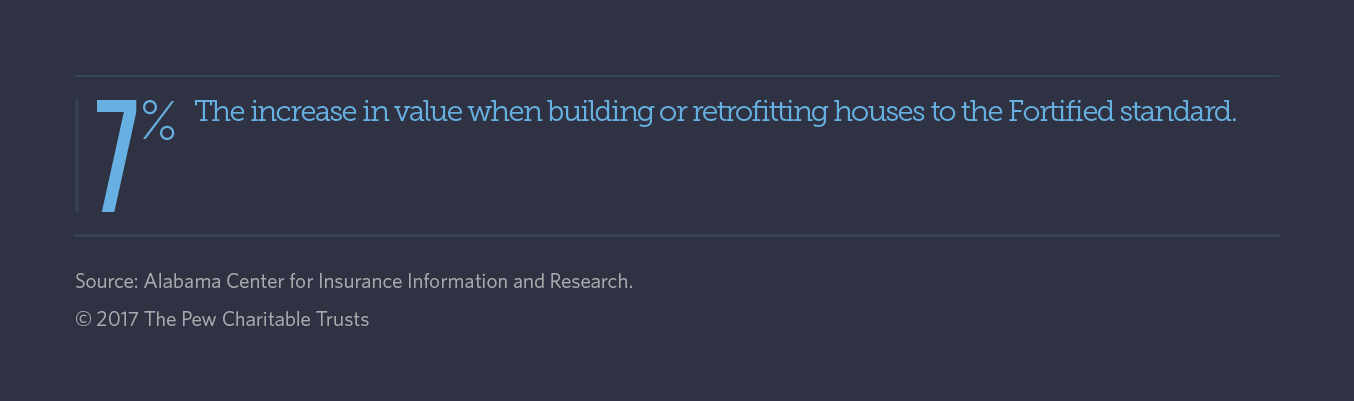 Depending on the size of a home, it costs about $10,000 to meet the minimum Fortified standard. But in addition to the insurance discount, Fortified homeowners may see as much as a 7 percent increase in their home value, according to the Alabama Center for Insurance Information and Research at the University of Alabama.
