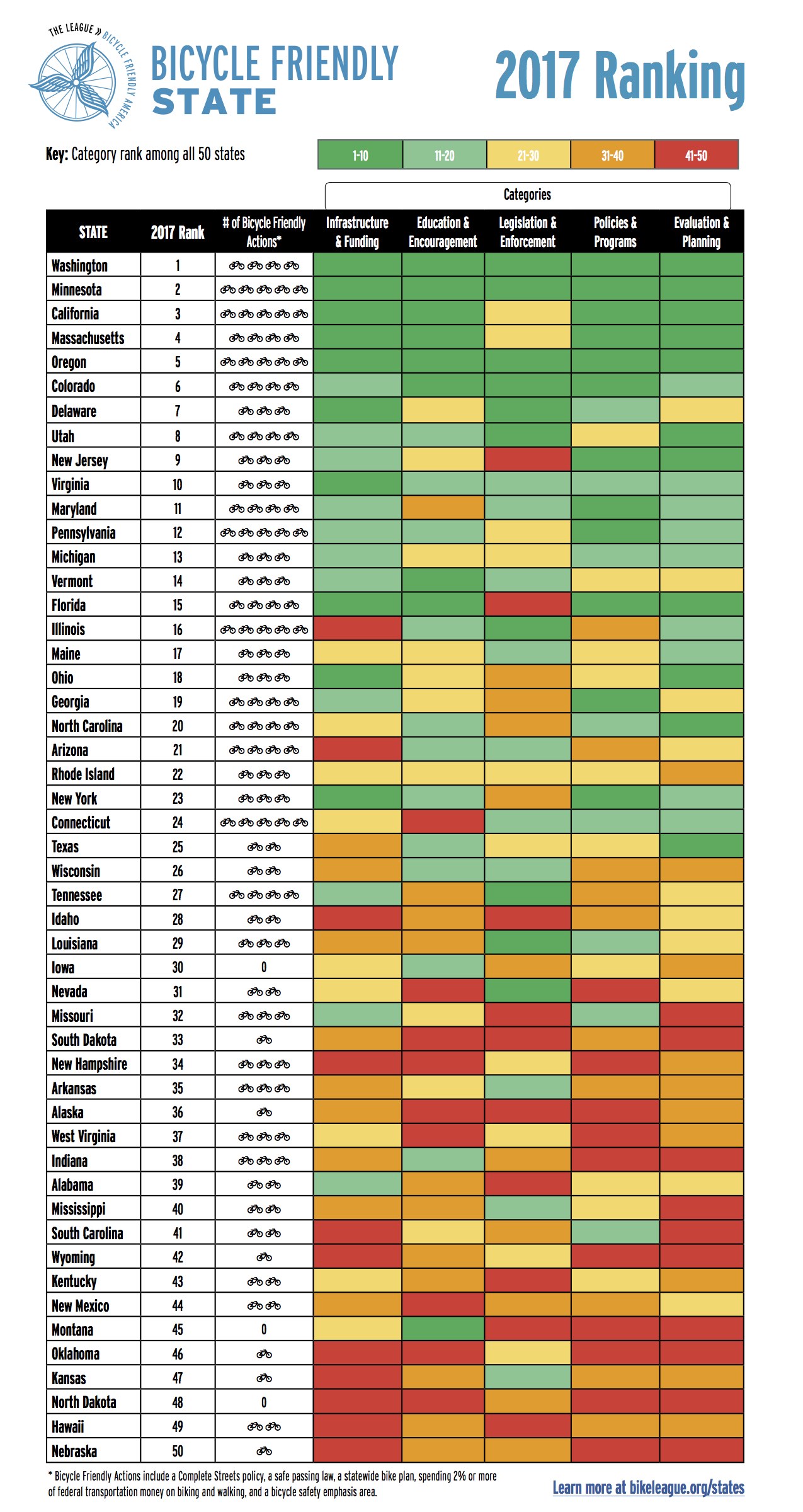 The League of American Bicyclists released its 2017 Bicycle Friendly State ranking on Wednesday. Each state’s ranking factors in weighted scores for how it performed in five categories: infrastructure and funding; education and encouragement; legislation and enforcement; policies and programs; and evaluation and planning.