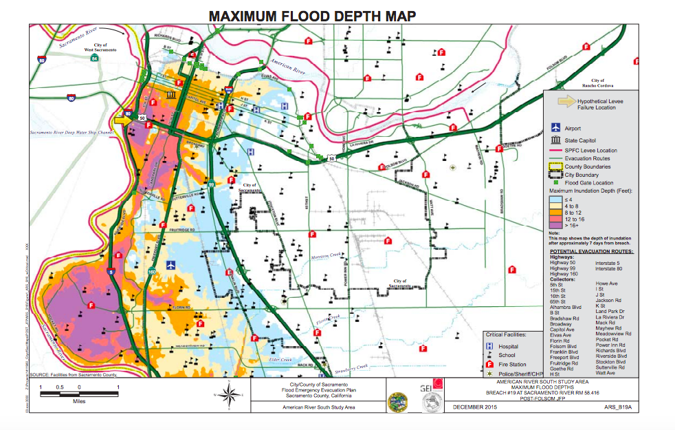 The city has other levee-breach scenarios, evacuation suggestions and flood-depth estimates, including one for the Sacramento River near downtown that floods significant sections of the city. Areas near the State Capitol would be flooded up to 8 to 12 feet and in the Pocket neighborhood, more than 16 feet.