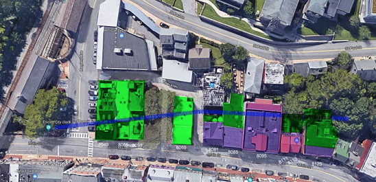 In this map of the affected part of Ellicott City, buildings in green are slated for demolition to make way for culverts in the stream (blue) underneath, while those in purple and pink will remain intact. (Howard County)