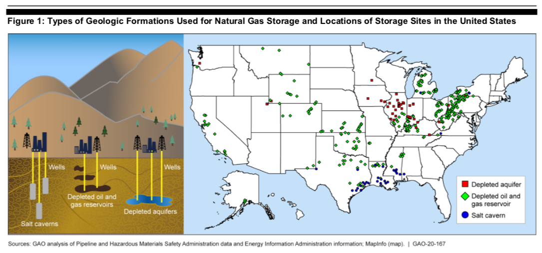 GAO says PHMSA data shows that about 10,000 wells at the nation’s natural gas storage sites have similar design features as the faulty well at Aliso Canyon. Other research has found that over 300 cities and populated areas are within three miles of the storage facilities.