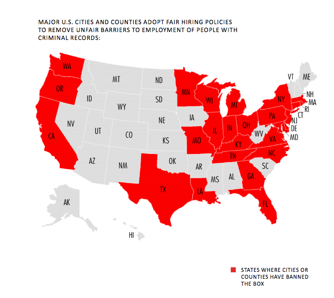 MAP: In red, states with cities and/or counties that have adopted "Ban the Box" policies. (via the National Employment Law Center)