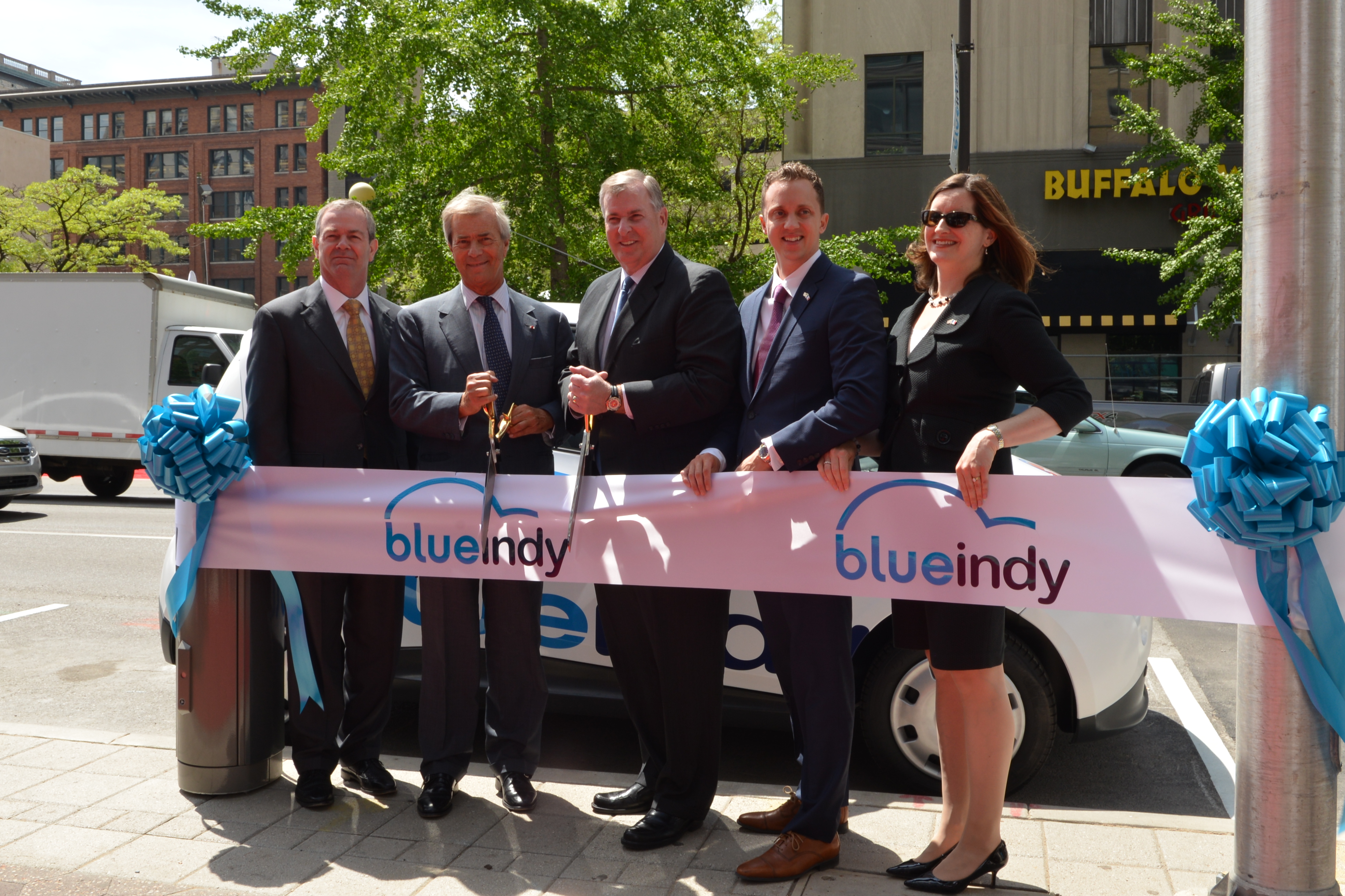 Indianapolis Mayor Gregory Ballard, center, seen here at the ribbon cutting to launch BlueIndy in May, wants his city's vehicle fleet to transition off foreign oil sources. (Photo courtesy BlueIndy)