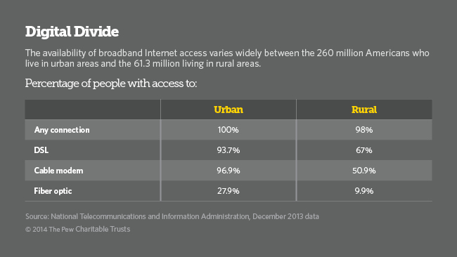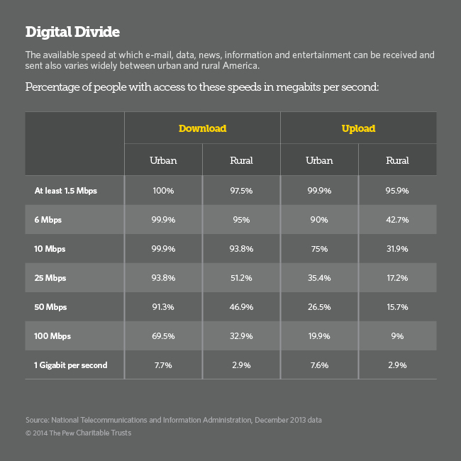 Rural areas are especially unlikely to have access to high-speed systems, according todata from the U.S. Commerce Department’s National Telecommunications and Information Administration. Ninety percent of residents in the nation’s urban areas have access to download speeds of greater than 50 Mbps, while less than half those in rural areas do.