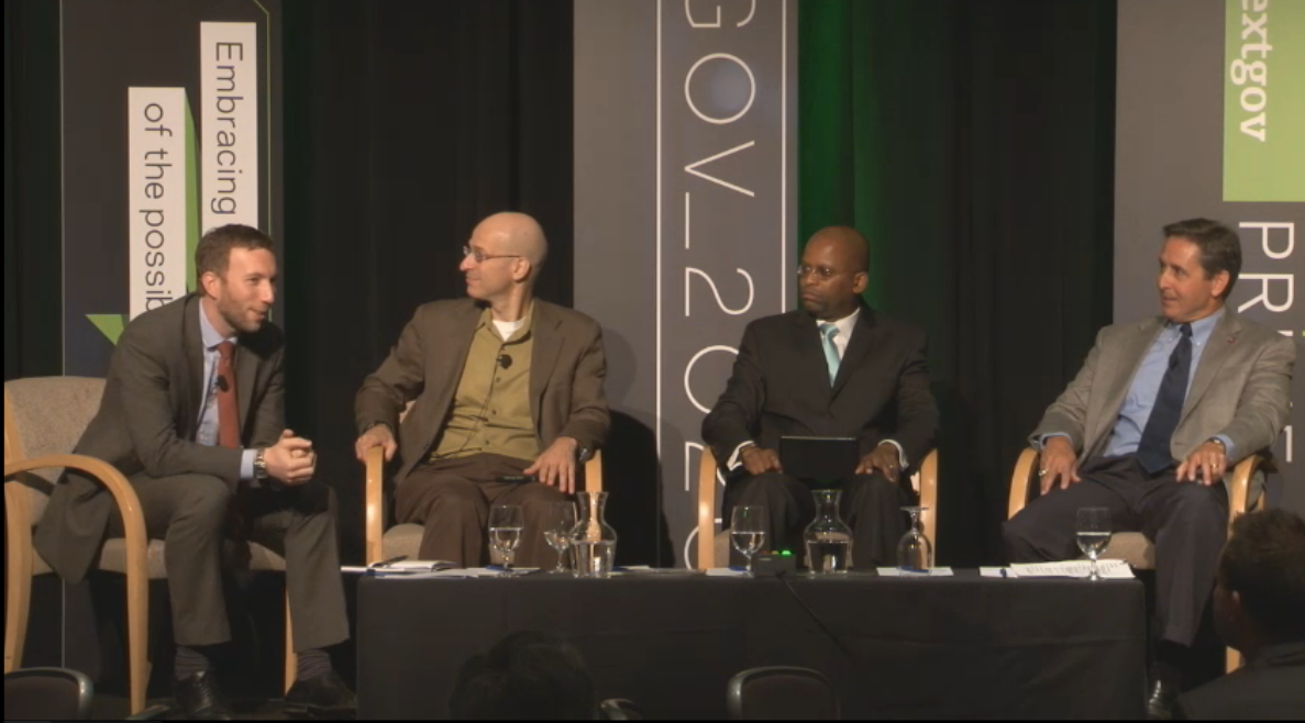 The panel from left, Mitch Herckis of NASCIO, Jonathan Feldman of Asheville, N.C., Adrian Gardner of FEMA and Rob Mancini of the D.C. government.