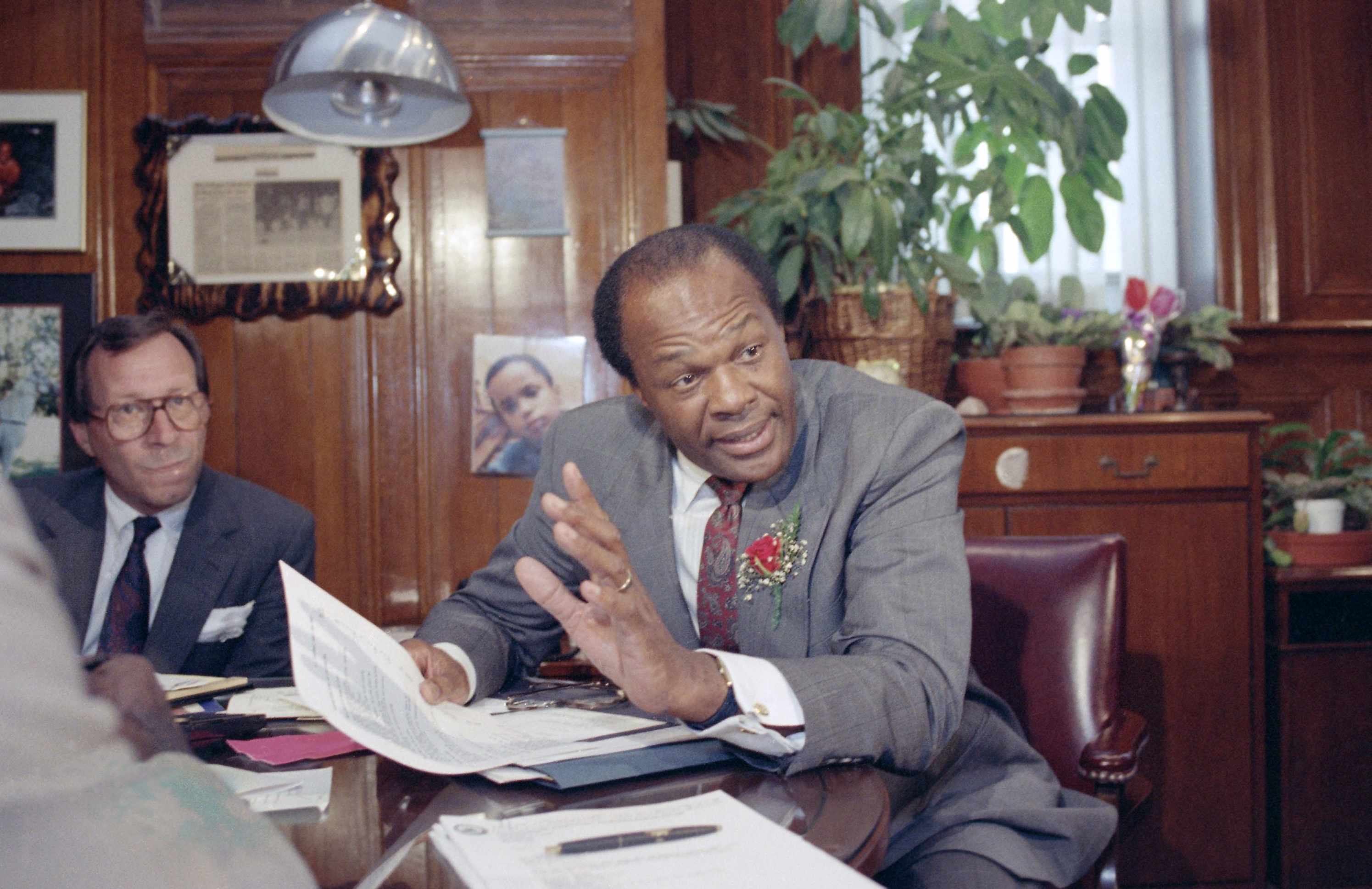 Then-D.C. Mayor Marion Barry talks to union representatives in his office at the District Building in Washington, D.C. on Wednesday, June 20, 1990 after spending the day at his drug and perjury trial at U.S. District Court. (Photo by Charles Tasnadi / AP)