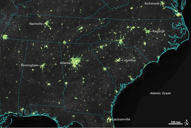 The space agency captured these festive views using the Suomi NPP satellite, which has a sensor so keen it sees boat lights as flaming beacons in the dark seas. After analyzing the satellite data of America's lights, NASA scientists determined they brightened early and in places with single-family houses and yards, i.e. the suburbs. They explain: