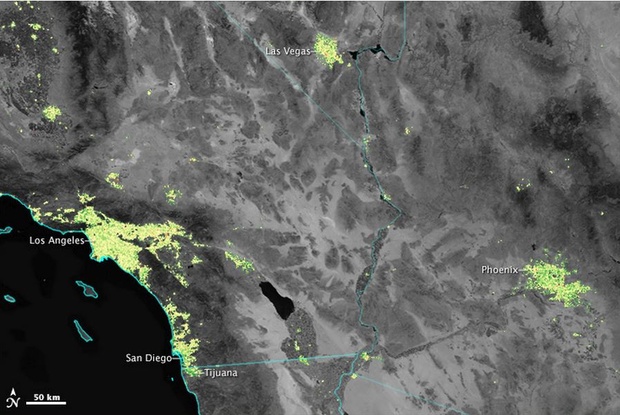 Snow cover fudges the signal, so the agency was only able to get images of warmer-weather cities. Here are the metropolitan centers of SoCal and the Southwest blossoming in the night: