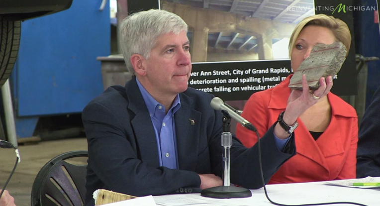 At a December press conference, Gov. Rick Snyder holds up a chunk of concrete that fell from an overpass. (Image via GovSnyder / YouTube)
