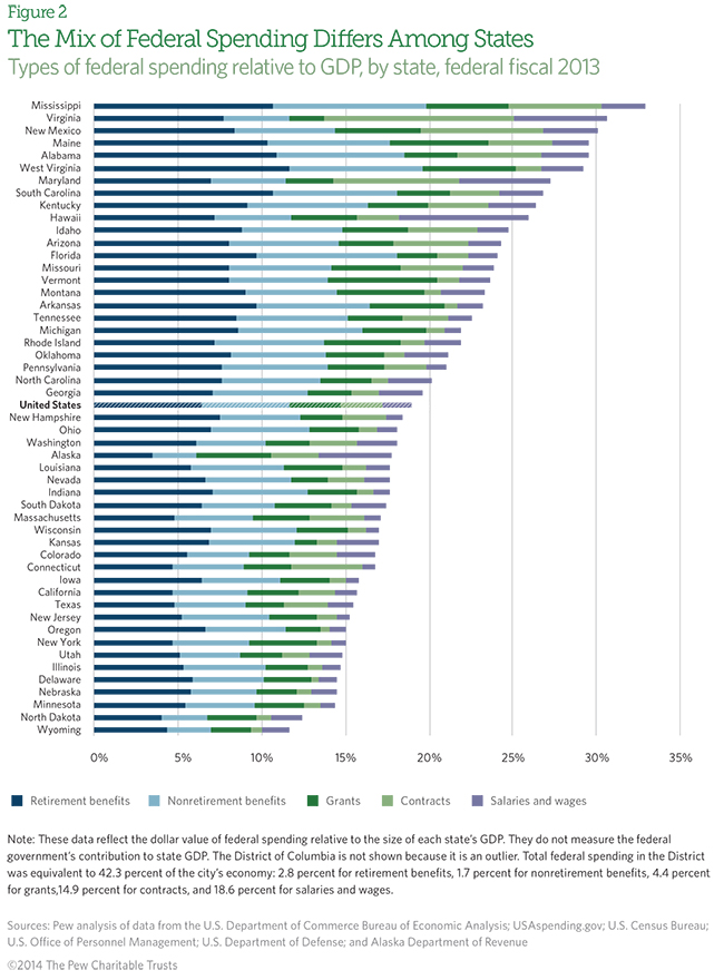 However, the Pew study notes that this percentage does not actually measure how much the federal spending directly contributes to each state’s economic activity. Pew also notes that the report does not factor in how much each state invests of its own tax dollars on various programs. Nonetheless, there’s no denying that Mississippi is particularly adept at acquiring a broad range of federal government contracts and benefits.