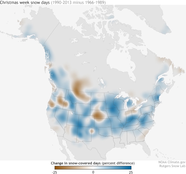 According to a NOAA analysis, the U.S. has seen an overall uptick in the number of snowy days during the week of Christmas in the past two decades, compared with the previous two decades.