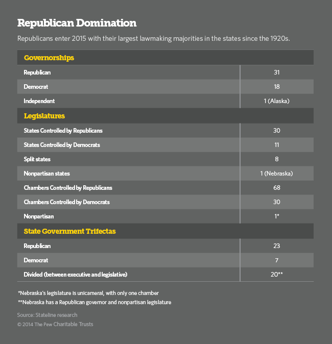 In November, the GOP won control of the governor’s office in 31 states and the legislature in 30. That’s up from 29 governorships and 27 legislatures in 2014. In 23 states, Republicans now control both the governor’s office and the legislature.