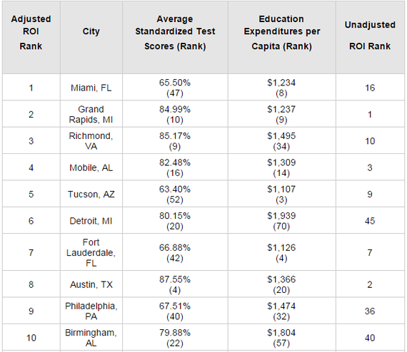 piece last year in USA Today by Michelle Rhee, a Democrat who formerly served as the chancellor of Washington, D.C., public schools, and Susan Combs, Texas' Republican public comptroller, reveals just how concerned public officials on both sides are about the misappropriation of government funds. Of course, education spending isn’t inherently bad—what matters is the result. Some school districts get lots in return for the amount of money they spend. And some governments have systems that track the return on investment. Texas, for example, launched a tool five years ago that assesses how school districts and individual campuses spend their money and compares the data with student achievement. Now, the online financial resource WalletHub has crunched the numbers on school spending at 90 of the most-populated cities across the country, revealing which ones are getting the most—and least—bang for their buck. To arrive at the findings, WalletHub divided each city’s aggregate test scores in fourth- and eighth-grade reading and math by its total per-capita education spending. The researchers then adjusted those figures for various socioeconomic factors, such as the poverty rate and percentage of households that don't speak English as their first language.