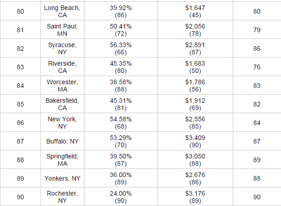 For some cities the data is all but indicting: At the bottom of the list is Rochester, New York, a city that is No. 2 for K-12 spending but has the lowest test scores. Jill Gonzalez, a spokeswoman for WalletHub, had this to say about the regional analysis: "As far as the Northeast goes these cities are spending upwards of $2,500 per capita and their test scores really aren’t showing that. They may have more money to spend on students but they are not using it efficiently."
