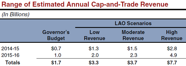 The state's latest budget anticipates about $1 billion dollars in total cap-and-trade revenue for 2015-16, leading to about $1.7 billion over 2014-2016. But when the state's Legislative Analyst's Office crunched the cap-and-trade numbers late last month, they were much higher. As in roughly twice as high for the LAO's most conservative 2014-16 revenue scenario, and about $6 billion higher in the most ambitious outlook.