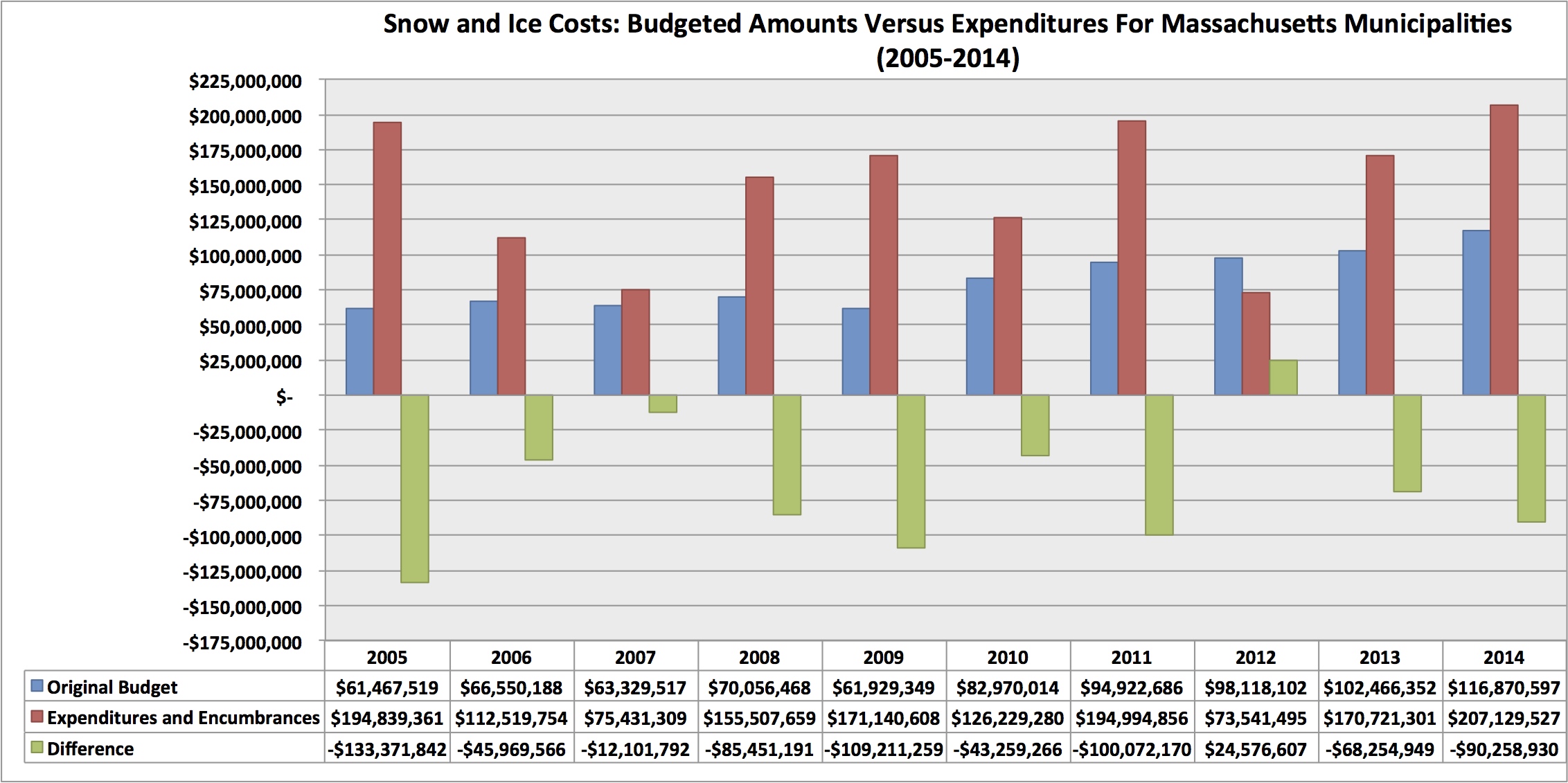 Between 2005 and 2014, the total amount of money that the 351 jurisdictions reported spending on snow removal was only within the bounds of the total amount budgeted during one year, 2012. That’s according to data maintained by the Massachusetts Department of Revenue Division of Local Services.